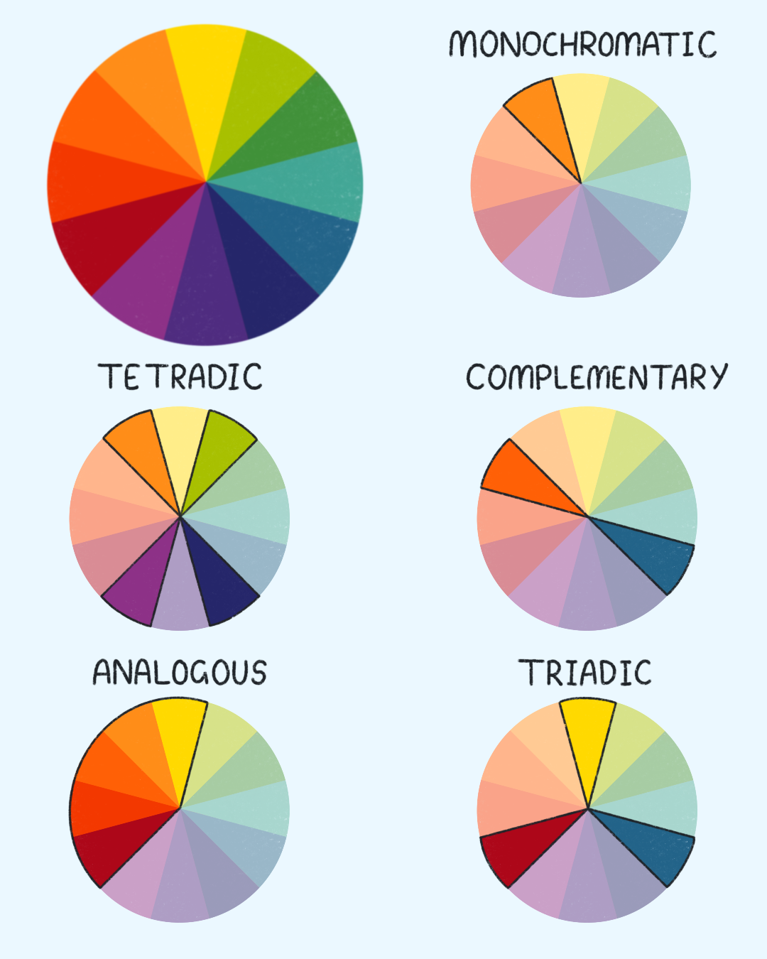 So, how do you harmonize all these colours and hues in your illustrations? A great starting point is creating a colour palette before diving into your artwork. You might choose to stick with a consistent palette across your pieces or create a new one tailored to each illustration. Here are some common types of colour palettes to consider: